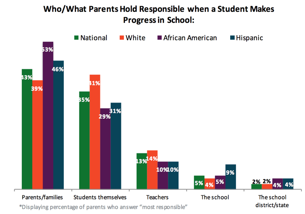 And yet, parents don’t really think schools or teachers have a big hand in determining if a child is learning. In a 2015 national poll of more than 1,000 parents nationwide, Education Post asked, “Who is most responsible if a student is making progress in school.” Forty-three percent said “parents/families” and 35 percent said “the students themselves.” Just 13 percent said “teachers” and just 5 percent listed “the school.” All told, barely 1 in 5 parents hold teachers, schools, districts or states “most responsible” for a child’s learning. And, when given a long list of “concerns,” the number one concern among all groups—Black, White and Hispanic—was, “Parents are not as involved in their child’s education as they should be.” So, parents say they value accountability and will do anything to get a good education for their kids, but they don’t hold anyone responsible for outcomes by exercising the most effective form of accountability in their control—strategically voting on the issue. The failure to hold elected officials responsible for school quality trickles down to the entire system. Voters don’t make politicians pay, and politicians do not make school systems pay. Few schools or educators face consequences for low performance.